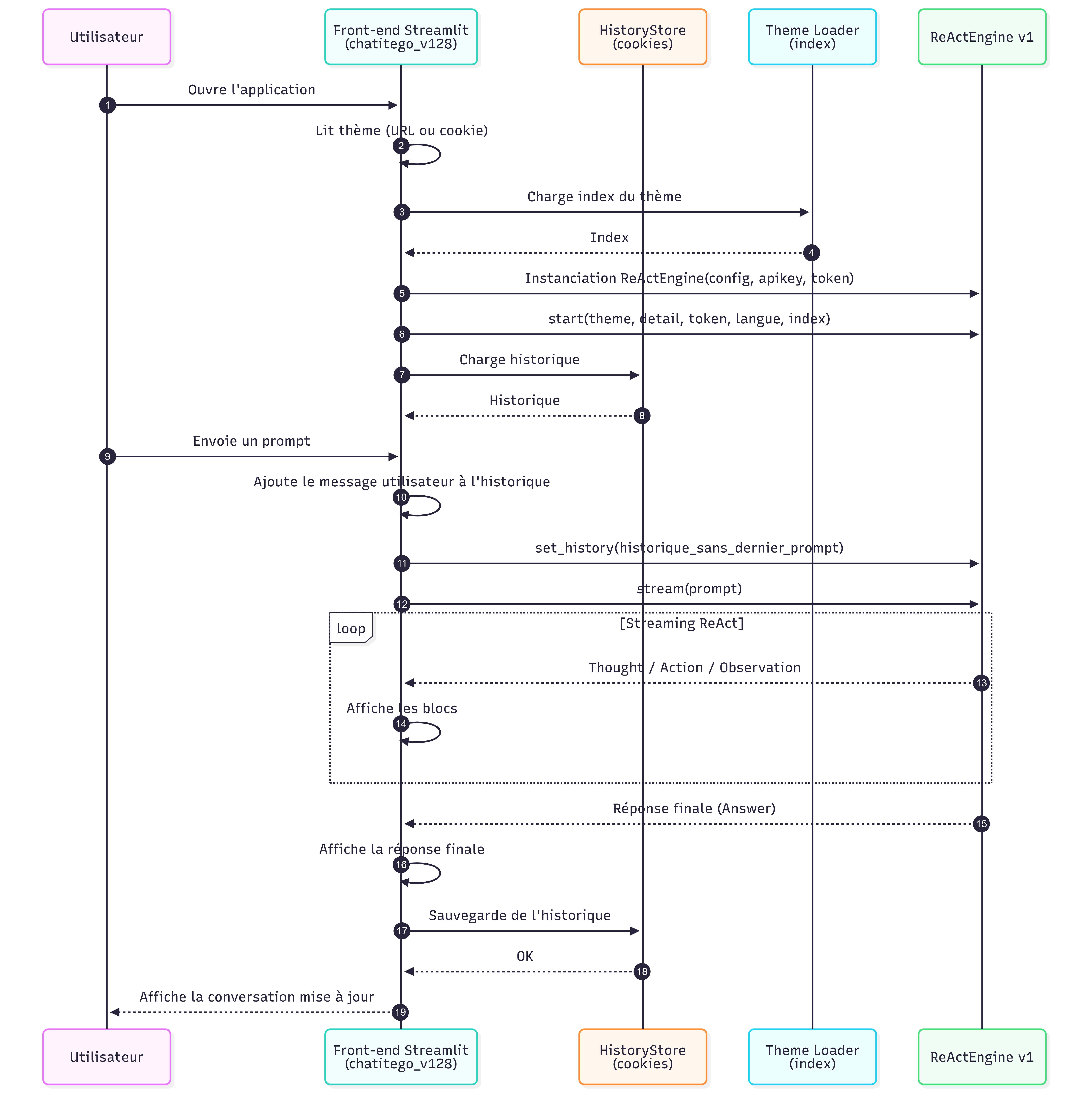 Il exécute ensuite la logique ReAct et renvoie un flux de blocs (Thought, Action, Observation, Answer).
