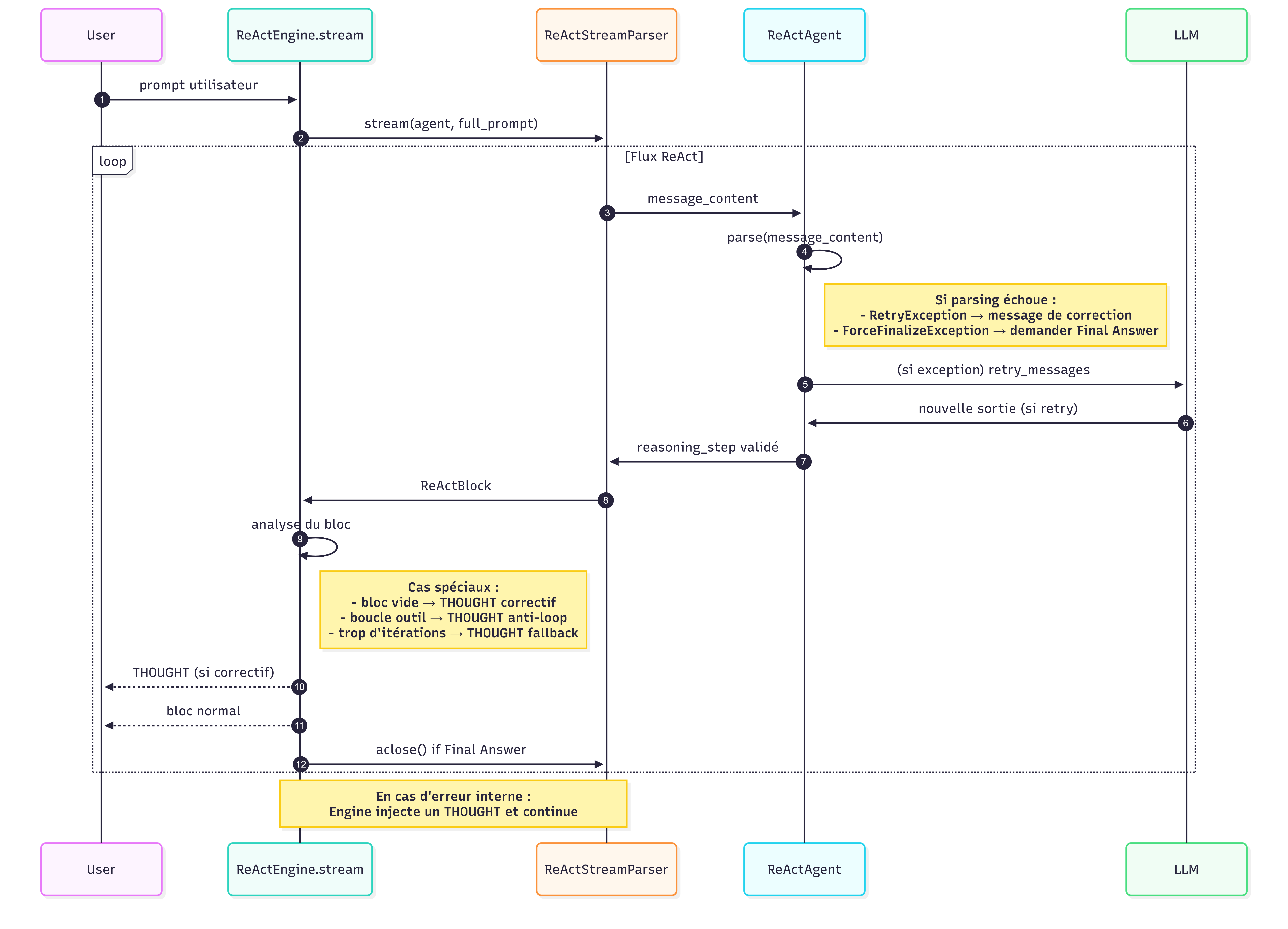 Les exceptions RetryException et ForceFinalizeException agissent entre 3 et 7 ( interne au ReActAgent ), l’insertion des Thoughts entre 8 et 12 ( le niveau d(orchestration par le Finalizer).